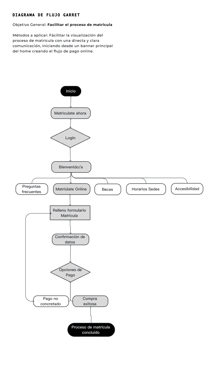Tomamos como base una conclusión para poder mejorar el flujo de la pagina web de ADL, www.desafiolatam.com, y que su proceso de matricula fuese más simple. Integramos métodos de registro de usuario y pago online para que fuera un proceso totalmente en linea, al igual que la mayoría de instituciones en Chile.